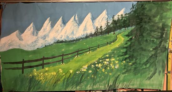 Le décor Chemin dans les pâturages fleuris, montagnes au fond